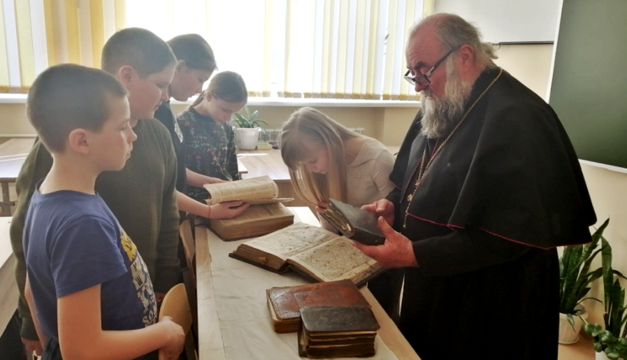С приветственным словом к детям обратился гость мероприятия настоятель храма Покрова Пресвятой Богородицы в г. Злынка — отец Владимир. Он рассказал о значении православной книги в духовно-нравственном воспитании человека, о том, какой след в душе человека может оставить печатное духовное слово, какой неисчерпаемый источник мудрости и благодати представляет собой православная книга. Дал практические советы по чтению Священного Писания. Интересно и доступно рассказал ребятам о значении книги в духовной и мирской жизни человека. Поведал, как важна вера в наше непростое время. Представил школьникам уникальные издания православных книг. В ходе мероприятия школьники смогли окунуться в мир православной литературы, которая воспитывает добрые чувства.